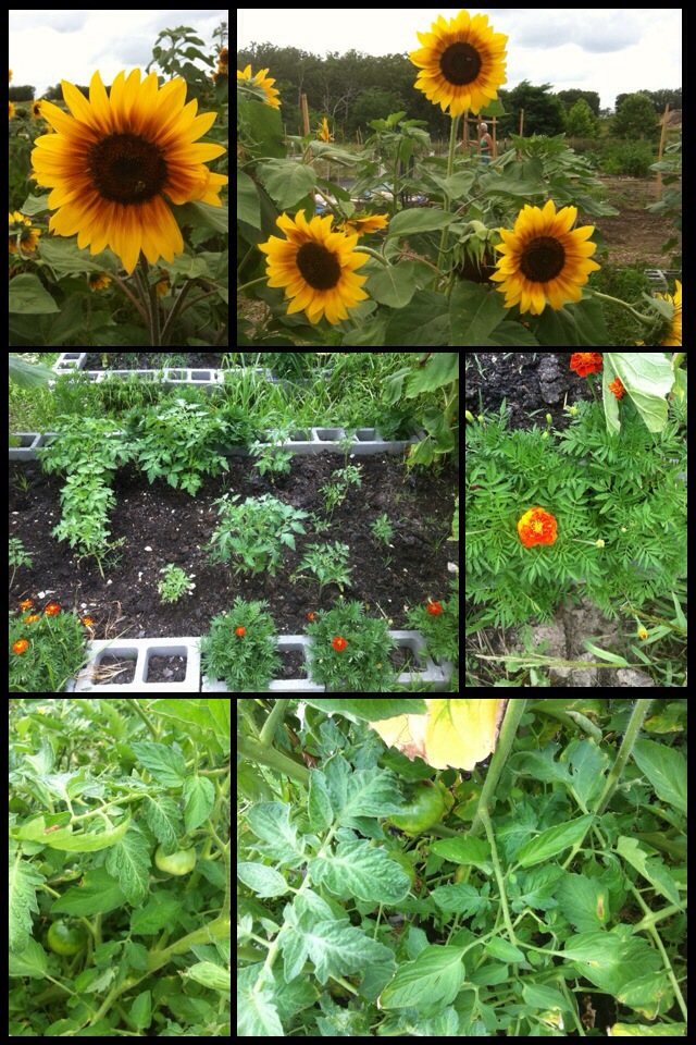 Lots of sunflowers and tomatoes coming in at the UUFR plots at the Rolla Community Garden. So far, so good.