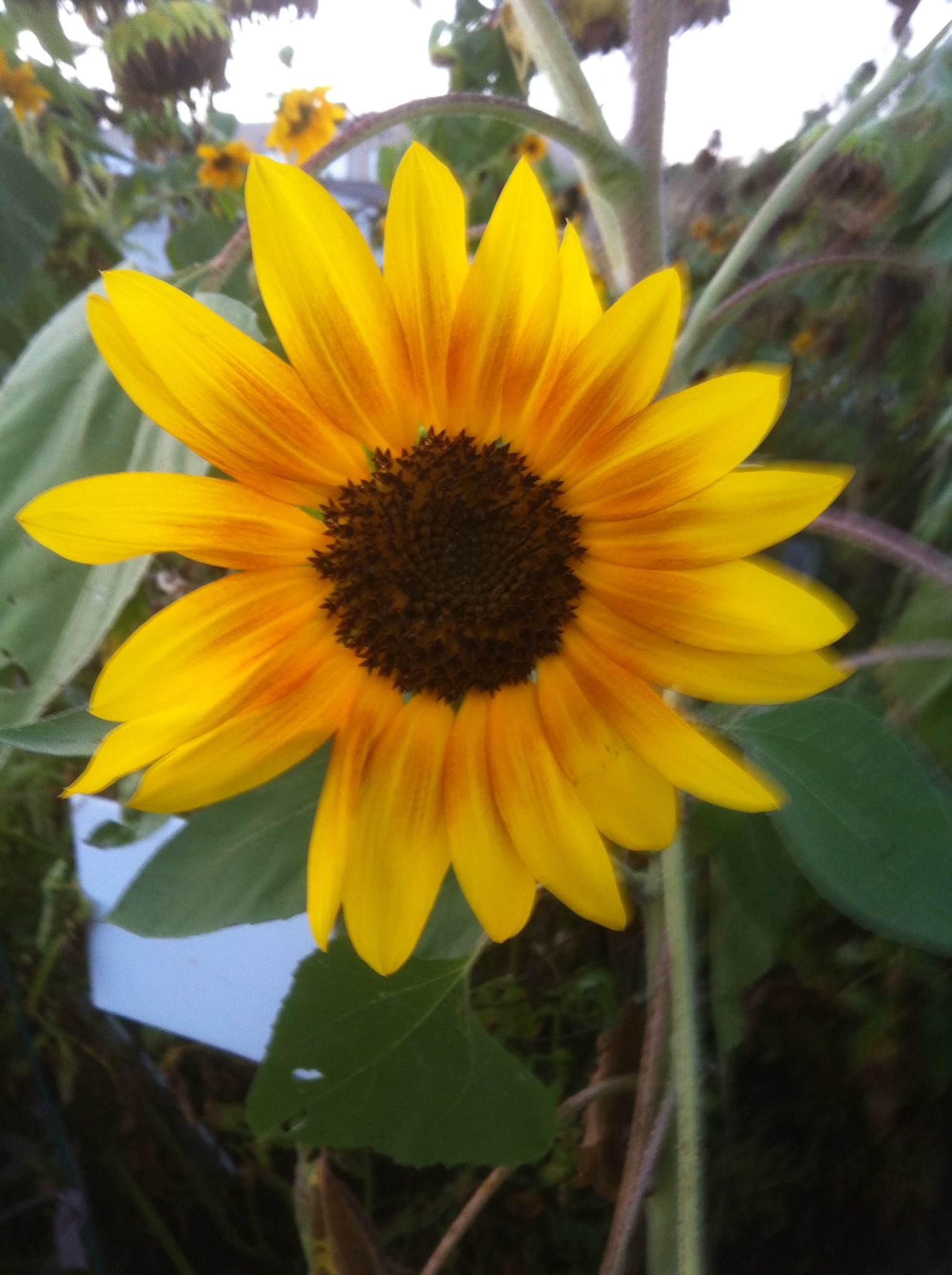 Our sunflowers have seen better days, but there is some life left. I did some weeding as well. — Travis