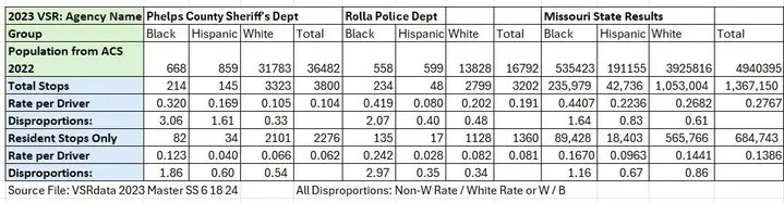 This chart shows that in 2022, the Rolla Police department stopped black individuals at a rate a little over 2x that of white people. Residents of Phelps County who are black are almost 3x as likely to get stopped as the white residents.