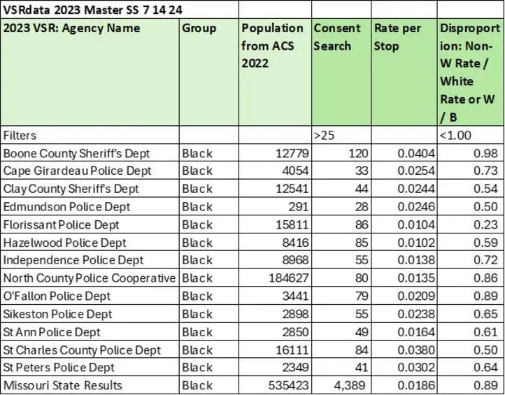 Our service this week featured a special guest speaker, Donald Love. Donald works for Empower Missouri, and he has been focusing on the vehicle stop data cities are required to provide. Mr Love has focused particularly on the data on Consent searches performed during Vehicle stops. A consent Search is when the law officer will ask or intimidate you into a consent search of the vehicle that you have a right to decline. Donald showed us the numbers sorted by race as well as other factors. He remarked there has been a reduction in the rates of stops and searches of black drivers. The rate found by the number of stops divided by the population. In the graphic below, are cities where the rate of stop and consent searches of black drivers is less than the rate of white drivers.